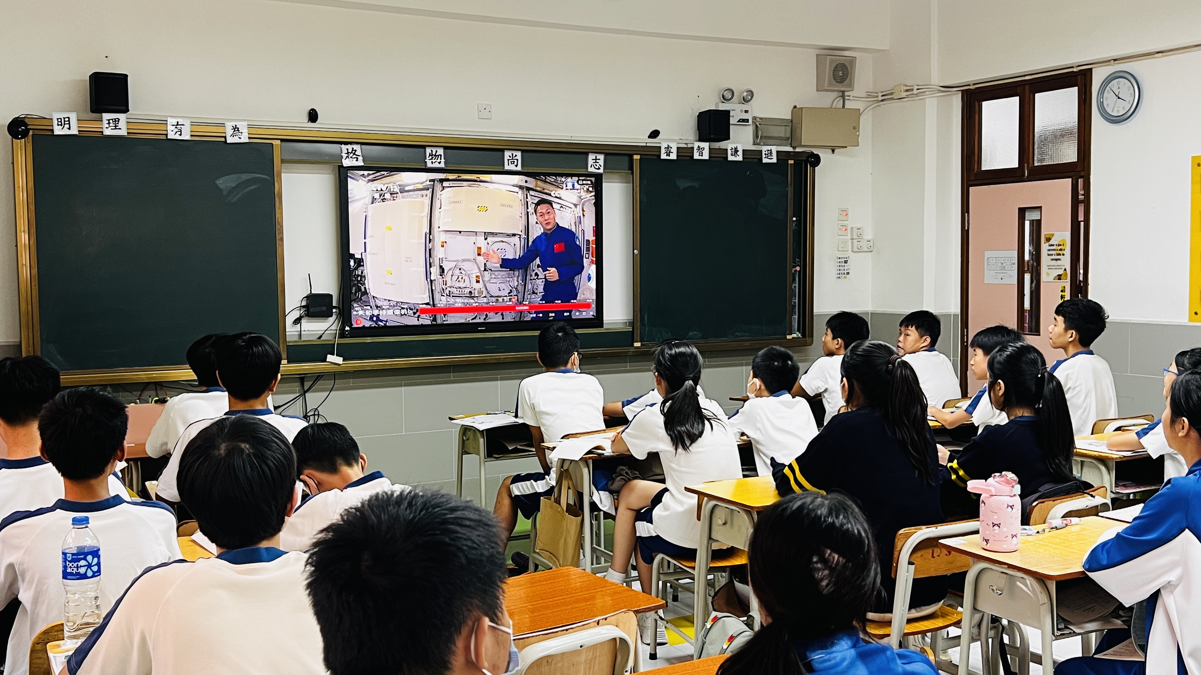 为加深学生对科学研究的兴趣、提升科学素养,培养更多科学家,新华学校(中学部)於九月二十一日下午在全校直播“天宫课堂”。三位神舟十六号航天员景海鹏、朱杨柱、桂海潮於天宫空间站进行“天宫课堂”第四课,以天地互动的教学方式,为学生生动演示了动量守恒、奇妙乒乓球等实验,学生认真观看,互相讨论,气氛热烈。
