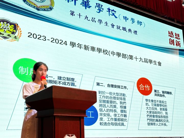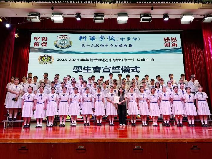 新華學校第十九屆學生會就職典禮不僅標誌著新一屆學生會任期的開始,同時代表了學生們對學校的承諾和責任感。學生會成員將以身作則,堅守「格物尚志」的校訓,秉承「堅毅奮發,孝悌創新」的校風,發揮團隊合作精神,熱心為全校師生服務,推動學校進步。相信在會長林芯瑜同學的帶領下,新一屆學生會成員將為學校帶來更多活力,關注並回應同學們的聲音和需求。讓我們共同祝願新一屆學生會成員在未來的一年中團結協作、勇於創新,再創新篇章!