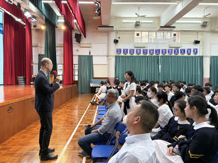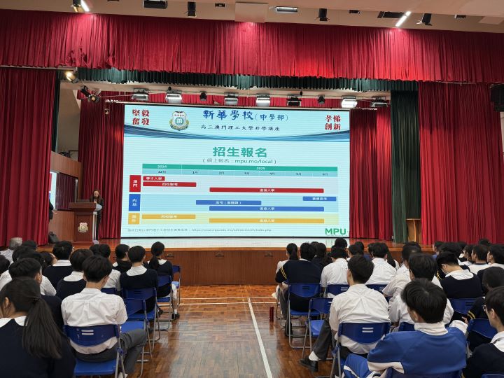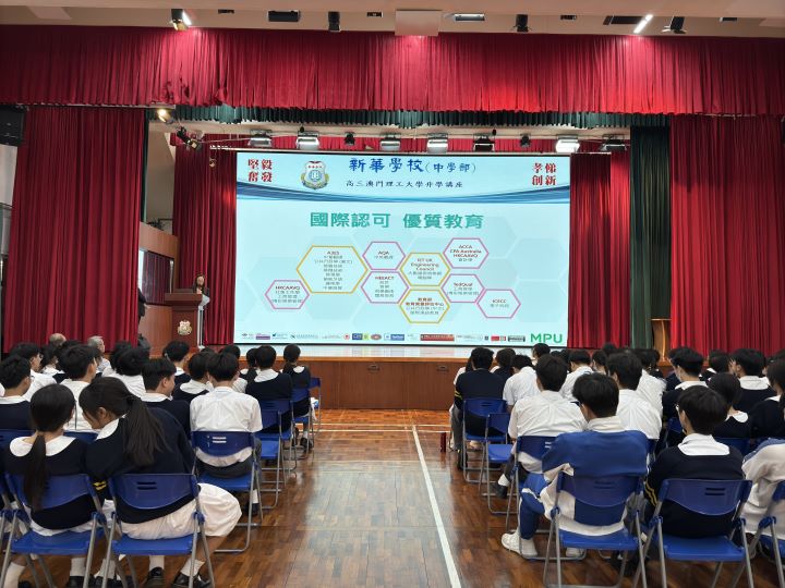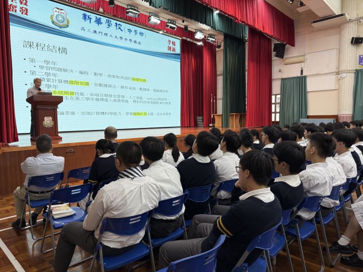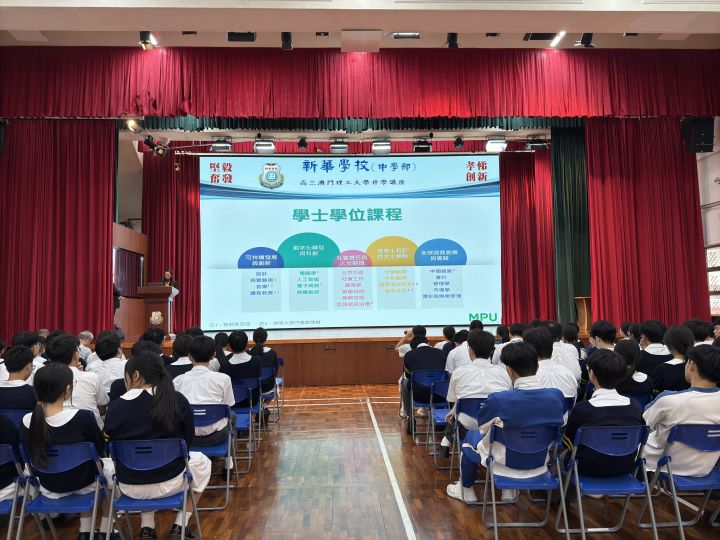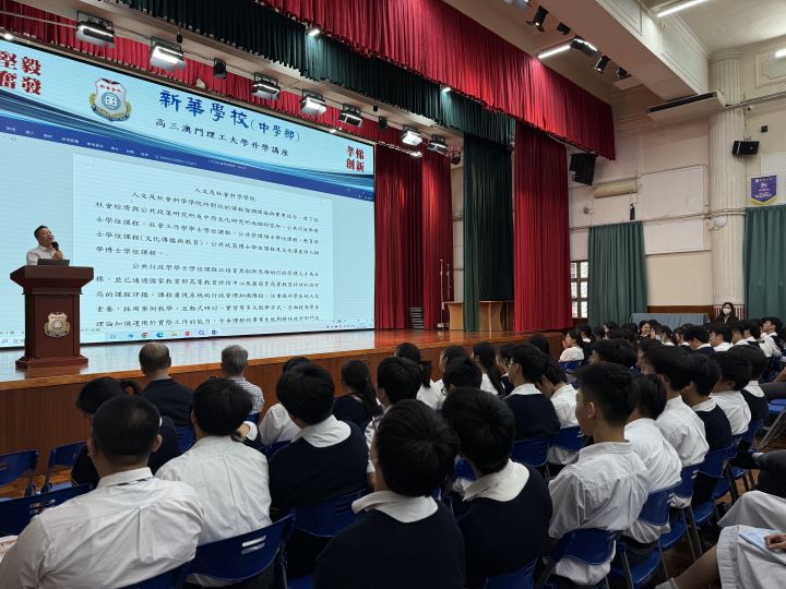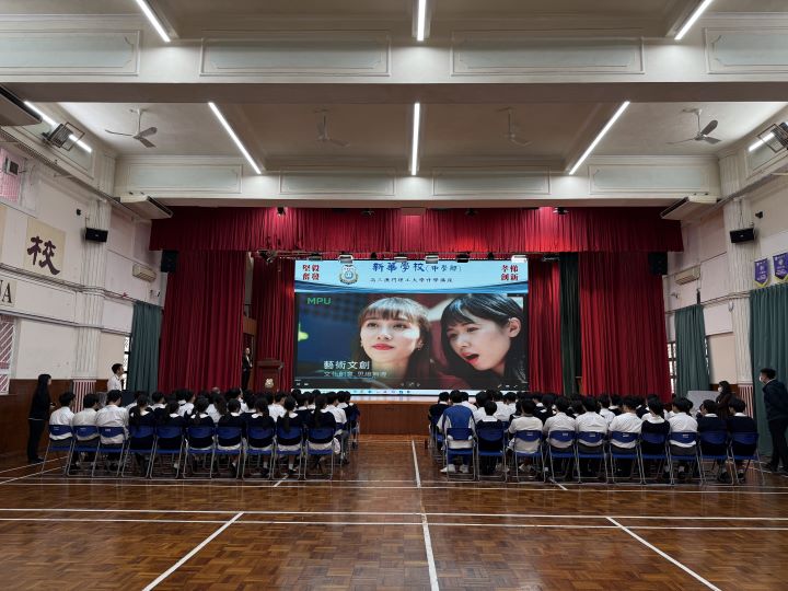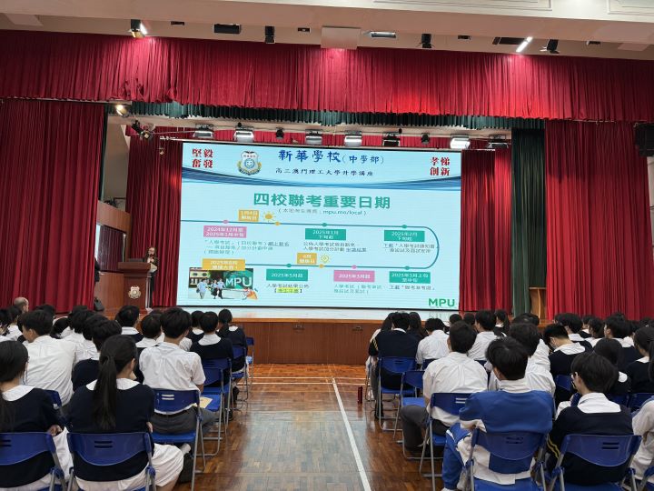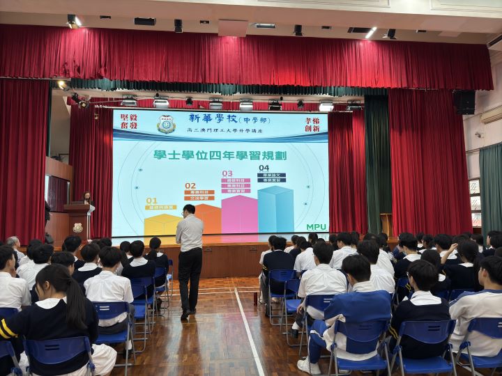 2024年11月5日下午,新華學校邀請到澳門理工大學的人文及社科學院姬朝遠教授、應用科學學院蕭嘉明教授及藝術及設計學院李澄暲副教授蒞臨本校,為高三全級學生舉辦升學講解會,介紹澳門理工大學的升學及相關科系的資訊。
