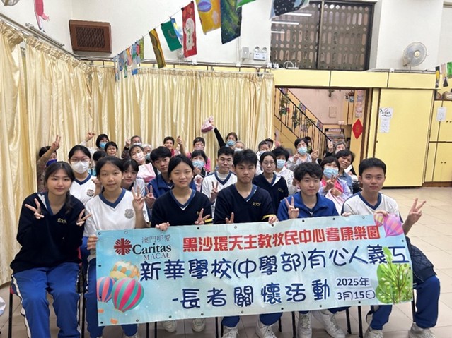 2025年3月15日,新華學校中學部「有心人義工組」的12名同學,在學生輔導員帶領下,到澳門明愛黑沙環天主教牧民中心耆康樂園開展「長者關懷活動」。此次活動旨在培養學生尊老敬老,弘揚中華傳統文化孝悌精神,提升長者幸福感,實踐代際共融的理念。