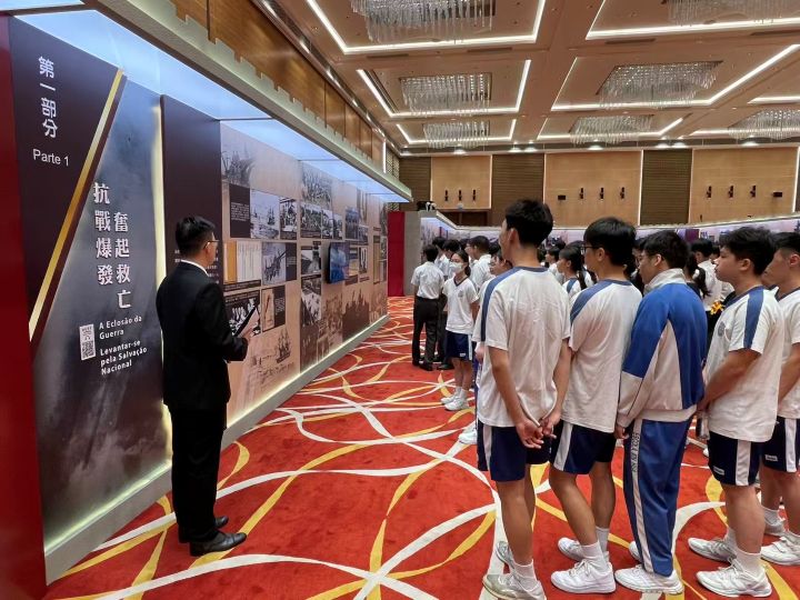 步入展覽現場,一幅幅泛黃的歷史照片、一段段詳實的文字記載、一件件珍貴的歷史資料,生動還原了中國人民在1937至1945年抗日戰爭的壯闊歷程。從艱苦卓絕的敵後遊擊戰,到氣壯山河的正面戰場抗爭,展覽系統梳理了中國人民在抗日戰爭中付出的巨大犧牲與取得的偉大勝利。其中,關於中國共產黨在抗戰中發揮的中流砥柱作用的展區,讓同學們深刻認識到,正是在中國共產黨的堅強領導下,全國各族人民凝聚起磅礴力量,築起了抵禦外敵的鋼鐵長城;而澳門抗戰力量的相關展示,更讓大家瞭解到澳門同胞與祖國同呼吸、共命運,積極投身抗戰洪流的愛國壯舉。
