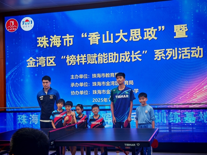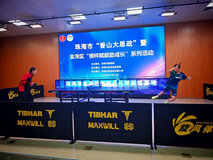 在第十五屆全國運動會即將到來之際,澳門將承辦兵乓球、三人籃球、五人籃球(男子18歲以下組)、排球(女子成年組)及空手道五個競賽項目。在體育盛事氛圍下,2025年10月27日下午,新華學校何校長應邀率三位中小學生代表,前往姐妹學校珠海市金灣區虹暉小學,共同參與“虹暉兵乓球訓練基地”揭牌儀式,並與中國國家兵乓球隊的優秀運動員錢天一、孫聞進行交流切磋。