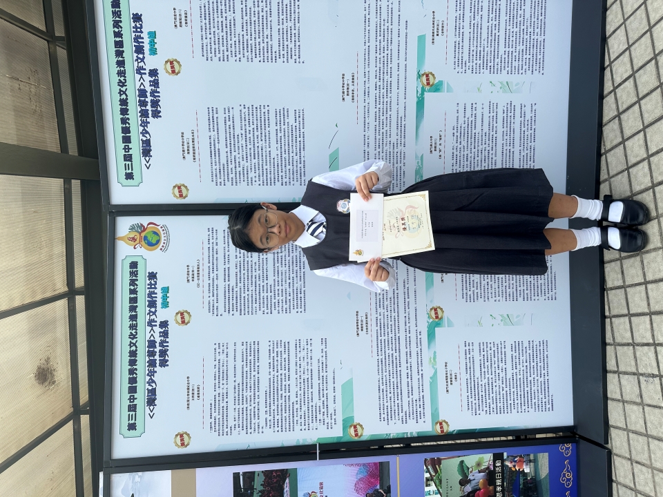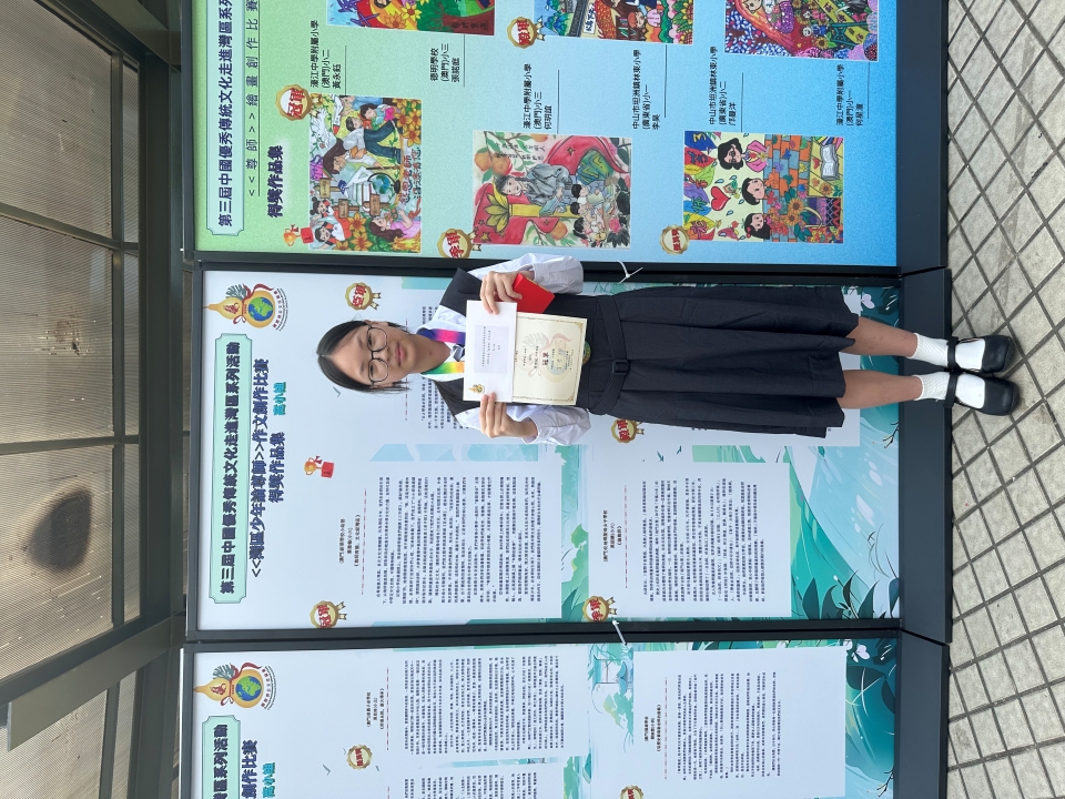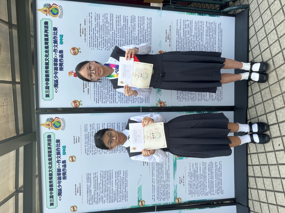 日前,我校初一C班蔡雅敏和初二D班陳曉彤同學,分獲由國際濟公文化協會舉辦《灣區少年論尊師》作文創作比賽高小組冠軍和初中組亞軍,初二D班柳雅君獲初中組優異獎。