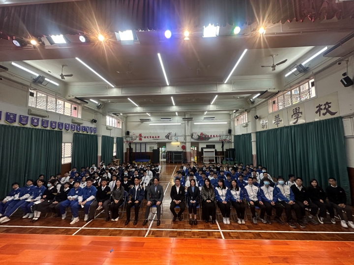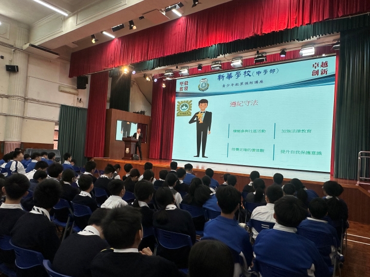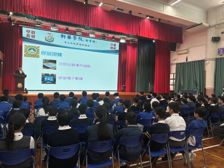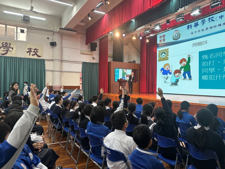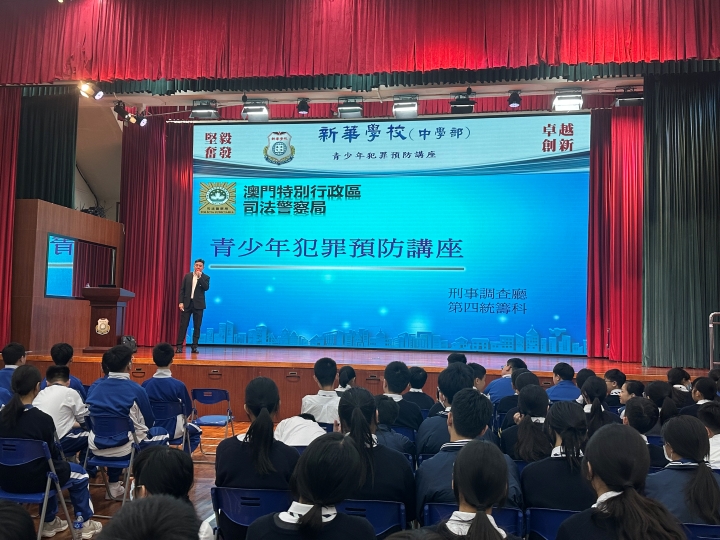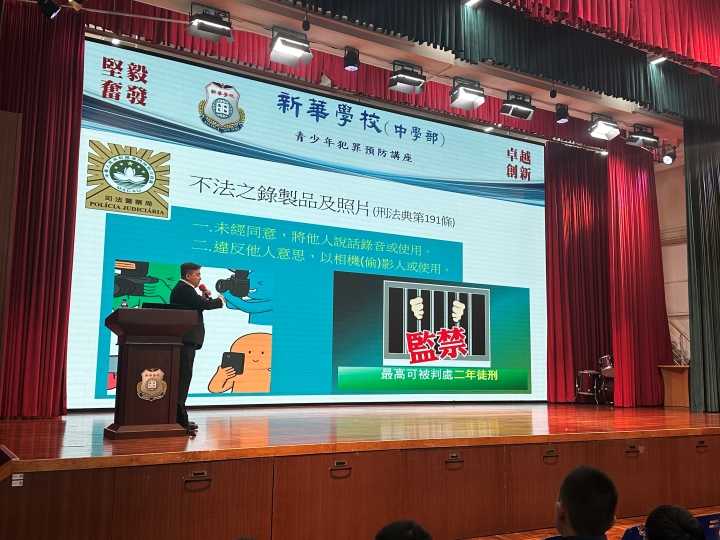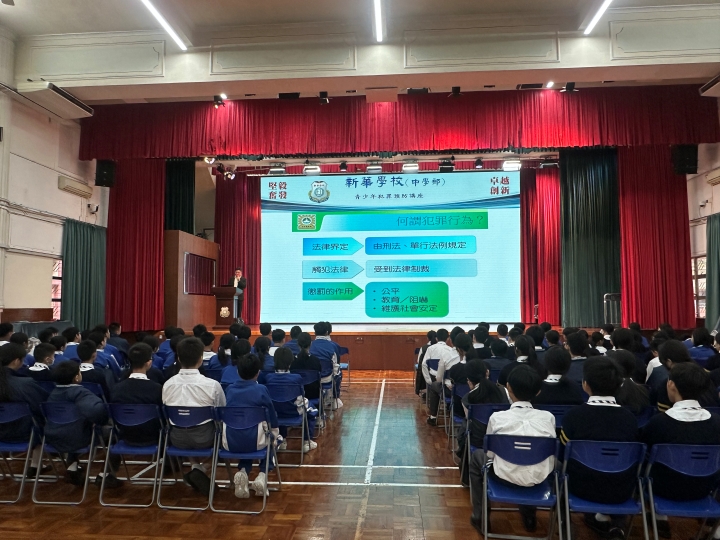 為加強青少年的法律意識,預防犯罪行為,新華學校於11月19日上午特邀澳門司法警察局人員到校,為初一級同學們舉辦「青少年犯罪預防」的專題講座,本次講座由司法警察局謝家豪首席刑事偵查員擔任主講。