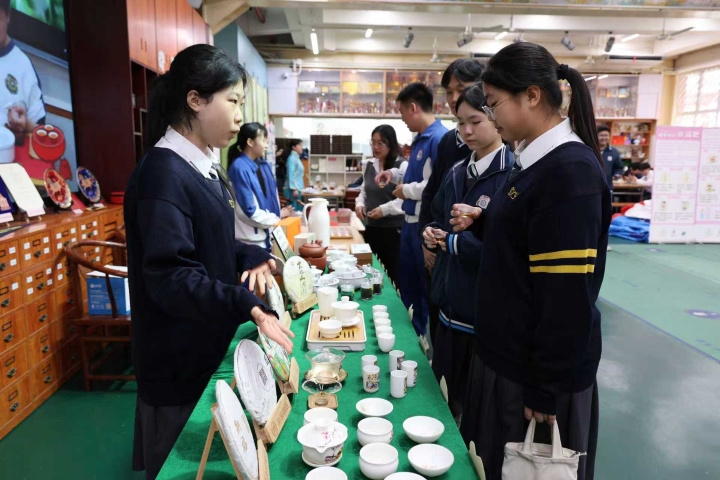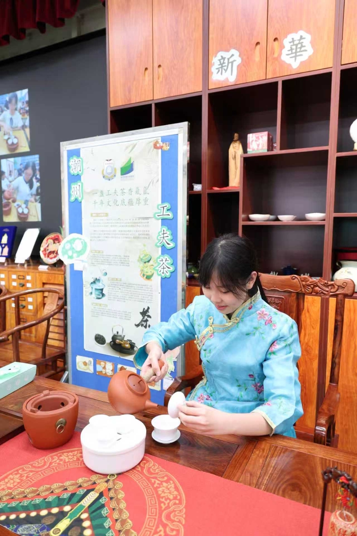 活動展呈白茶、黃茶、黑茶等六大茶類,茶文化班學員全程負責茶品展示、講解介紹與引導品茗,讓師生深入認知各類茶品的獨特魅力。現場設置多個特色展區與體驗區,學員展演九式潮式工夫茶之沖茶新九式(一、禮敬匠茗,二、溫甌納茶,三、熱盞滾杯,四、甘泉潤茶,五、茶暖杯溫,六、高沖低泡,七、關公巡城,八、韓信點兵,九、共品佳茗),盡顯傳統茶藝精髓,茶具展區匯聚傳統陶土與卡通創意茶具,學生作品區展出黏土(泥塑)茶具模型和手抄報;每日由餘暇潛能班的同學快閃演奏小提琴、笛子、二胡、揚琴和阮;師生可在“墨韻迎春”書法體驗區即席揮毫;繽紛彩茶區介紹色彩絢爛的花茶,如洛神花茶、蝶豆花茶、黑枸杞茶,展示茶湯變色的科學小實驗,吸引眾多學生圍觀體驗。